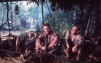 En contraste con este lirismo, Goldsmith despliega una paleta orquestal agresiva y experimental para las secuencias de fuga y los momentos de tensión en la selva. Aquí, el compositor utiliza percusiones metálicas, maderas en registros extremos y técnicas de vanguardia que subrayan la hostilidad del entorno. La música se vuelve atonal y caótica, reflejando no solo el peligro físico de la jungla, sino también la desorientación y el agotamiento mental de los fugitivos.